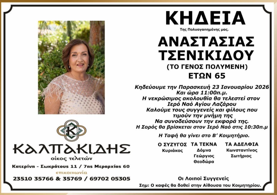 Έφυγε από τη ζωή η Αναστασία Τσενικίδου, σε ηλικία 65 ετών, σκορπίζοντας βαθιά θλίψη στην οικογένεια, στους συγγενείς και στους φίλους της.
