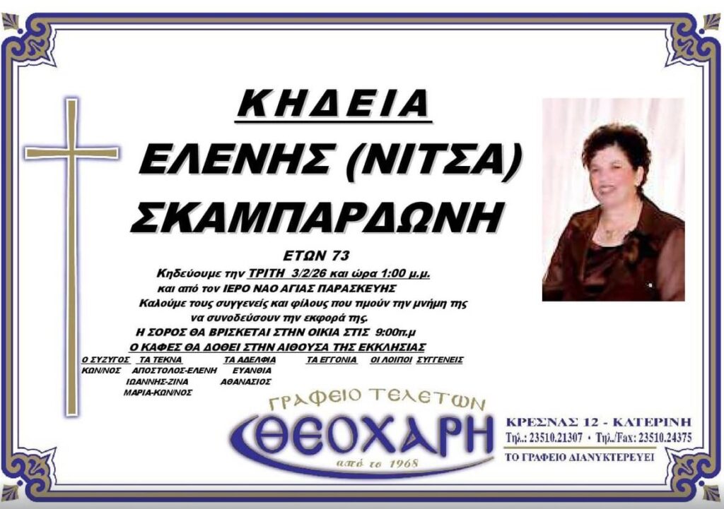Με βαθιά θλίψη ανακοινώνουμε τον θάνατο της Ελένη Νίτσα Σκαμπαρδώνη, σε ηλικία 73 ετών, που σκόρπισε θλίψη σε συγγενείς και φίλους.