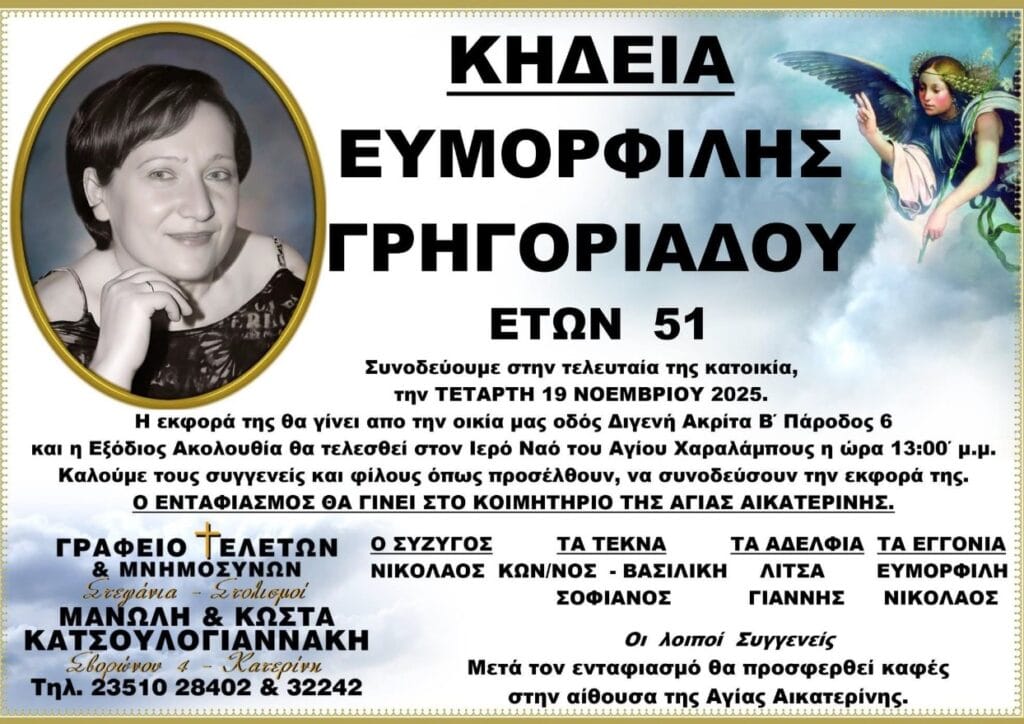 Με βαθιά θλίψη ανακοινώνουμε ότι έφυγε από τη ζωή η Ευμορφιλής Γρηγοριάδου, σε ηλικία 51 ετών, σκορπίζοντας τη λύπη σε συγγενείς και φίλους.
