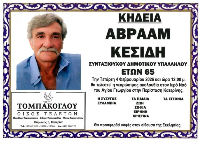 Με βαθιά θλίψη ανακοινώνουμε τον θάνατο του Αβράαμ Κεσίδη, σε ηλικία 65 ετών, ο οποίος σκόρπισε θλίψη σε συγγενείς και φίλους.