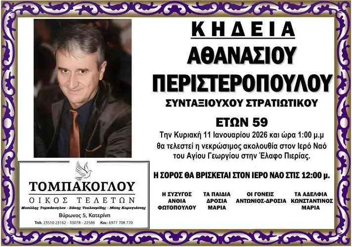 Έφυγε από τη ζωή ο Αθανάσιος Περιστερόπουλος σε ηλικία 59 ετών, σκορπίζοντας θλίψη σε συγγενείς, φίλους και όσους τον γνώριζαν.