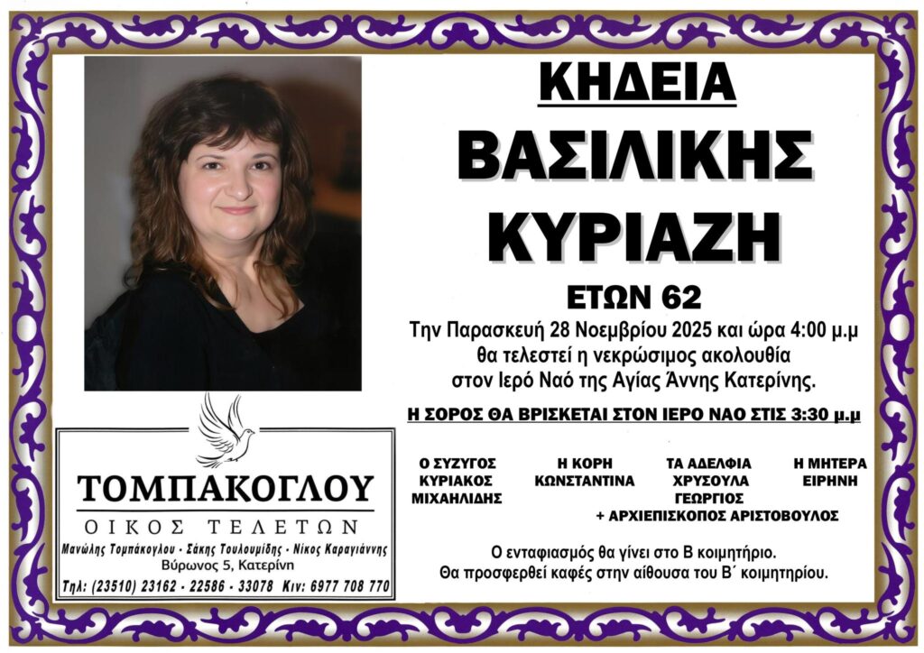Με μεγάλη θλίψη αποχαιρετούμε τη Βασιλική Κυριαζή, που έφυγε από τη ζωή σε ηλικία 62 ετών.
