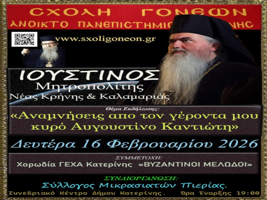 «Αναμνήσεις από τον γέροντα μου κυρό Αυγουστίνο Καντιώτη» το θέμα της εισηγήσεως του Μητροπολίτη Νέας Κρήνης & Καλαμαριάς κ.κ. ΙΟΥΣΤΙΝΟΥ στην Σχολή Γονέων – Ανοικτό Πανεπιστήμιο Κατερίνης την Δευτέρα 16 Φεβρουαρίου 2026.