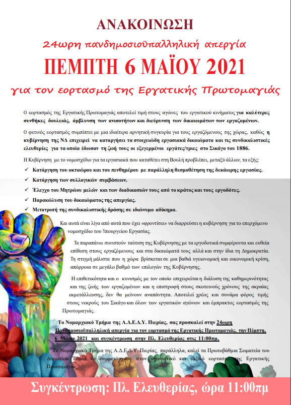 Συγκέντρωση Πλατεία Ελευθερίας, ώρα 11:00΄ π.μ. Πέμπτη 6 Μαΐου 2021.