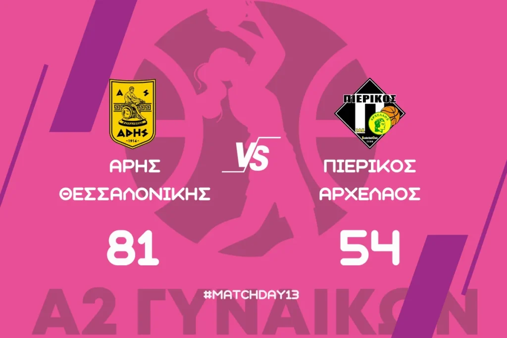 Ο Πιερικός Αρχέλαος ηττήθηκε με 81-54 από τον Άρη Θεσσαλονίκης στο Αλεξάνδρειο Αθλητικό Μέλαθρο Θεσσαλονίκης σε αγώνα για την 13η αγωνιστική του 2ου ομίλου της Α2 Εθνικής Κατηγορίας Γυναικών.