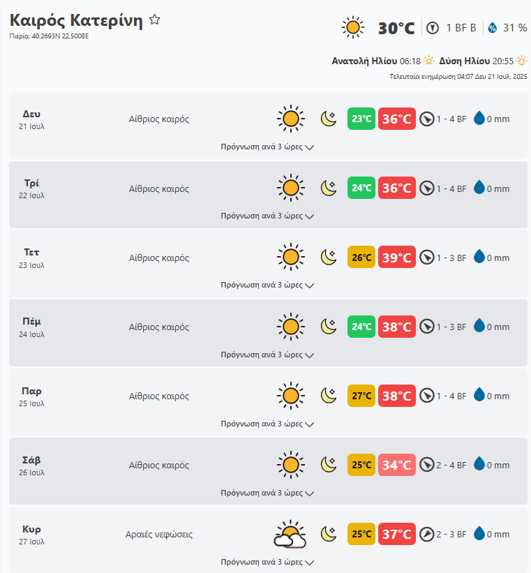 Δευτέρα 21 Ιουλίου o καιρός στην Πιερία. Δείτε τι καιρό θα κάνει το επόμενη εβδομάδα