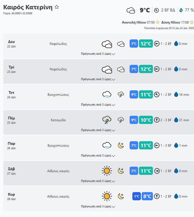 Δευτέρα 22 Δεκεμβρίου ο καιρός στην Πιερία. Δείτε τι καιρό θα κάνει το επόμενη εβδομάδα