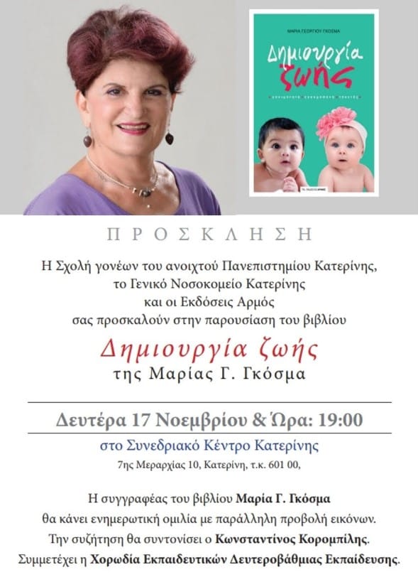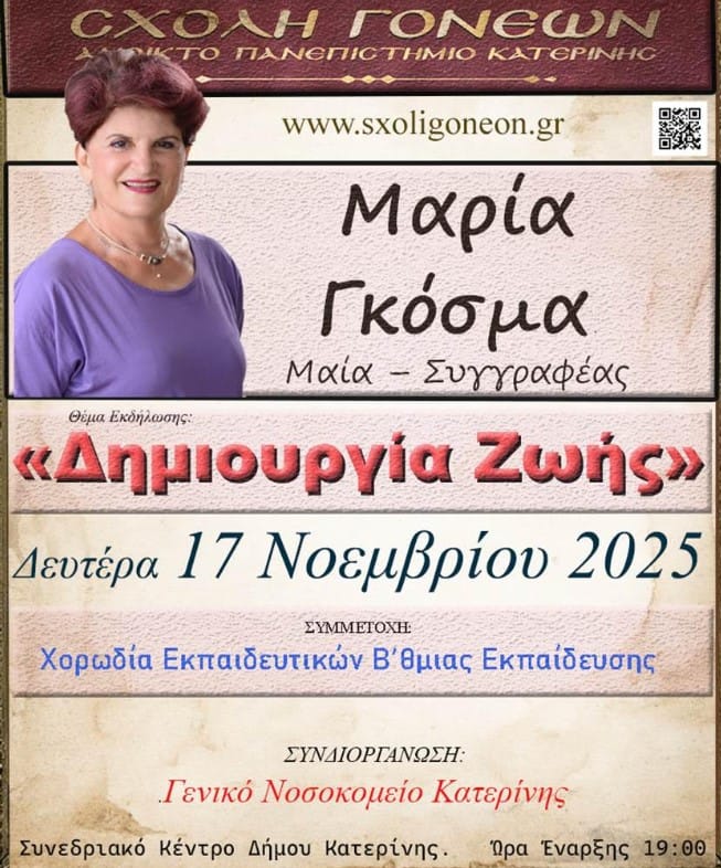 «Δημιουργία Ζωής» είναιτο θέμα της ομιλίας που θα πραγματοποιηθεί την Δευτέρα 17 Νοεμβρίου 2025 από την Σχολή Γονέων Κατερίνης με επίσημη ομιλήτρια και καλεσμένη την συγγραφέα και Μαία κ. Μαρία Γκόσμα.