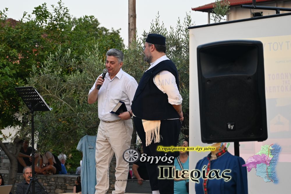 Ακολούθησε προβολή σύντομου βίντεο με χαιρετισμό από τον πρώτο χοροδιδάσκαλο του Συλλόγου και σήμερα εικαστικό διεθνούς φήμης, κ. Αστέριο Γκέκα. Στη συνέχεια, ο φιλόλογος κ. Ιωάννης Τζιόλας παρουσίασε τις παραδοσιακές κρήνες της παλιάς Λεπτοκαρυάς, καθώς και τους «μαχαλάδες» με τις τοπικές ονομασίες που χαρακτήριζαν τις γειτονιές και τους κατοίκους του χωριού.