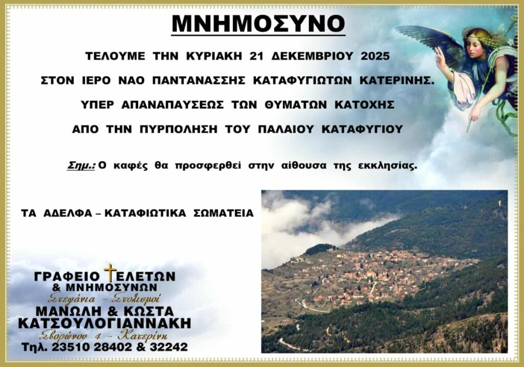 Την Κυριακή 21 Δεκεμβρίου 2025 θα τελεστεί μνημόσυνο υπέρ αναπαύσεως των θυμάτων της Κατοχής, που έχασαν τη ζωή τους κατά την πυρπόληση του παλαιού Καταφυγίου.