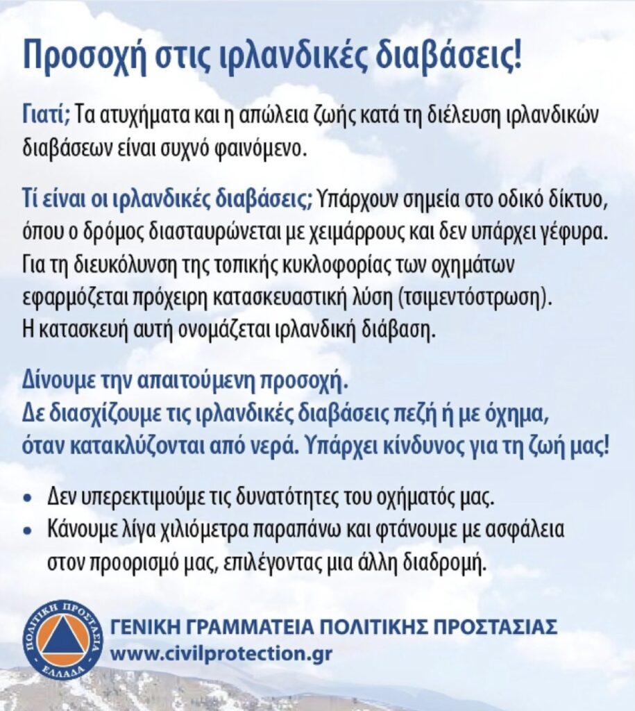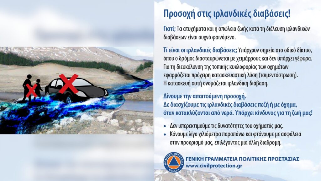 Να αποφεύγουν να διασχίζουν χειμάρρους και ρέματα, πεζή ή με όχημα, κατά τη διάρκεια καταιγίδων και βροχοπτώσεων, αλλά και για αρκετές ώρες μετά το τέλος της εκδήλωσής τους