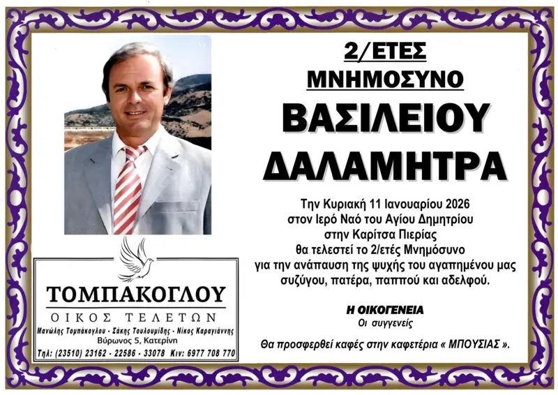 Την Κυριακή 11 Ιανουαρίου 2026 θα τελεστεί το 2ετές Μνημόσυνο υπέρ αναπαύσεως της ψυχής του Βασιλείου Δαλαμήτρα,