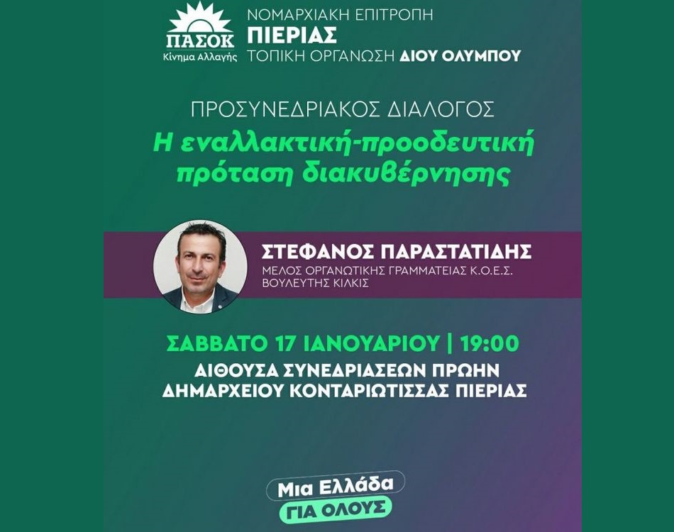 Η Νομαρχιακή Επιτροπή Πιερίας του ΠΑΣΟΚ – Κινήματος Αλλαγής και η Τοπική Οργάνωση Δίου Ολύμπου διοργανώνουν εκδήλωση στο πλαίσιο του προσυνεδριακού διαλόγου με θέμα:
