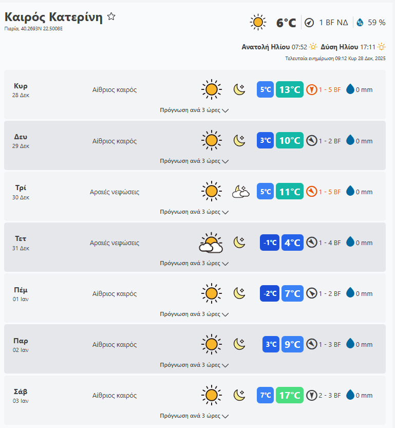 Κυριακή 28 Δεκεμβρίου ο καιρός στην Πιερία. Δείτε τι καιρό θα κάνει το επόμενη εβδομάδα