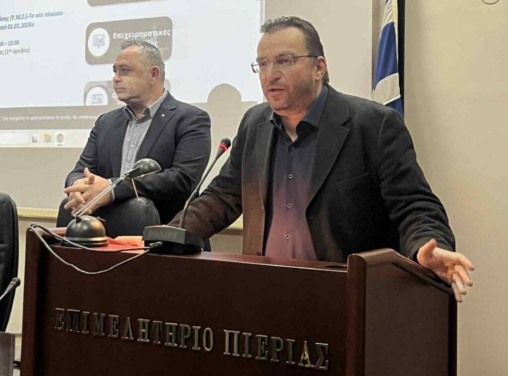 Τον Πρόεδρο του Επιμελητηρίου Πιερίας, Κωνσταντίνο Πίτσια, εκπροσώπησε ο Γενικός Γραμματέας, Δανιήλ Σαμαράς. Στον χαιρετισμό του υπογράμμισε ότι βασική προτεραιότητα του Επιμελητηρίου αποτελεί η έγκαιρη και αξιόπιστη ενημέρωση των επιχειρήσεων-μελών του. Όπως τόνισε, στόχος της ημερίδας ήταν να αποτελέσει ένα χρήσιμο εργαλείο ενημέρωσης και να προσφέρει πρακτική γνώση που θα υποστηρίξει την καθημερινή λειτουργία των επιχειρήσεων.