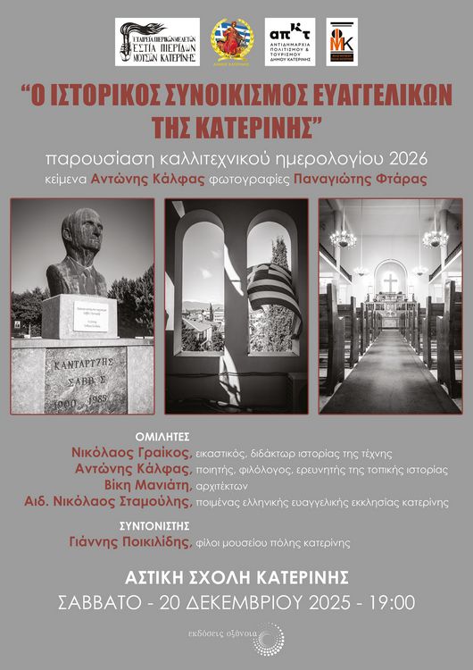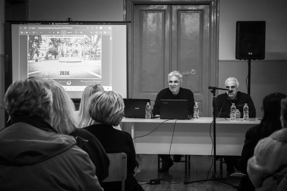 Στην ωραία παρουσίαση του Ημερολογίου 2026 με θέμα του τον ιστορικό προσφυγικό συνοικισμό των Ευαγγελικών (εκδόσεις Οξύνοια, φωτογραφίες Π. Φτάρα και κείμενα Α. Κάλφα), οι Κατερινιώτες φιλίστορες είχαν την ευκαιρία να ακούσουν την ιστορική πορεία και την ιδιαιτερότητα του συνοικισμού με συνδιοργανωτές την αντιδημαρχία πολιτισμού, τους Φίλους Μουσείου Πόλης και την Εστία Πιερίδων Μουσών.