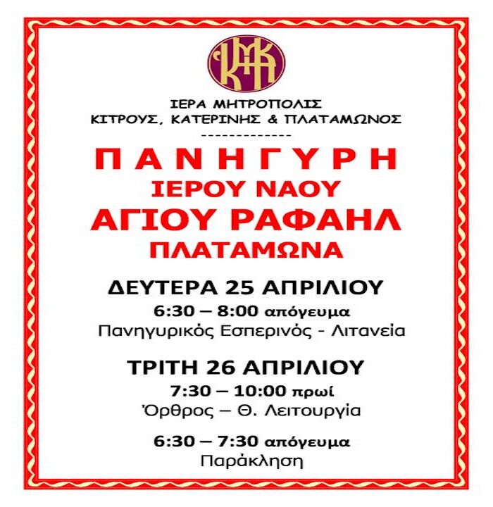 Πανηγυρίζει ο Ιερός Ναός Αγίου Ραφαήλ στον Πλαταμώνα