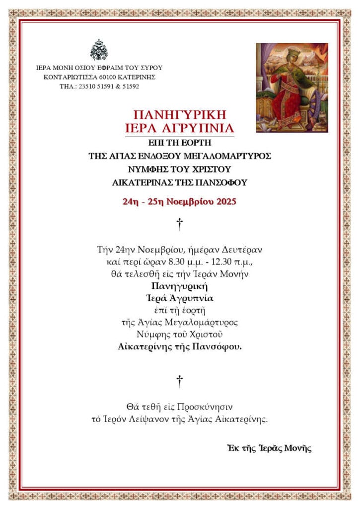 Η Ιερά Μονή ανακοινώνει ότι τη Δευτέρα 24 Νοεμβρίου 2025, από 8:30 μ.μ. έως 12:30 π.μ., θα τελεστεί Πανηγυρική Ιερά Αγρυπνία επί τη εορτή της Αγίας Ενδόξου Μεγαλομάρτυρος και Νύμφης του Χριστού Αικατερίνης της Πανσόφου.