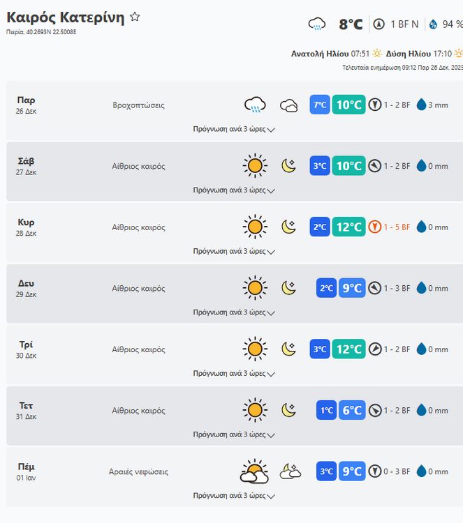 Παρασκευή 26 Δεκεμβρίου o καιρός στην Πιερία. Δείτε τι καιρό θα κάνει το επόμενη εβδομάδα