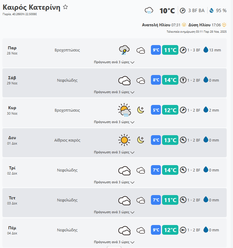 Παρασκευή 28 Νοεμβρίου o καιρός στην Πιερία. Δείτε τι καιρό θα κάνει το επόμενη εβδομάδα