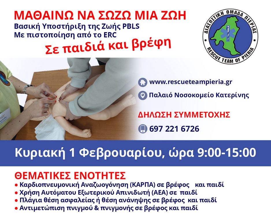 Η Διασωστική Ομάδα Πιερίας θα πραγματοποιήσει δύο πιστοποιήσεις πάνω στη Βασική Υποστήριξη της Ζωής.