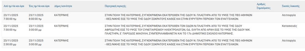 Σύμφωνα με ενημέρωση από τον ΔΕΔΔΗΕ, στις 23/11, Νοεμβρίου θα πραγματοποιηθούν προγραμματισμένες διακοπές ηλεκτροδότησης .