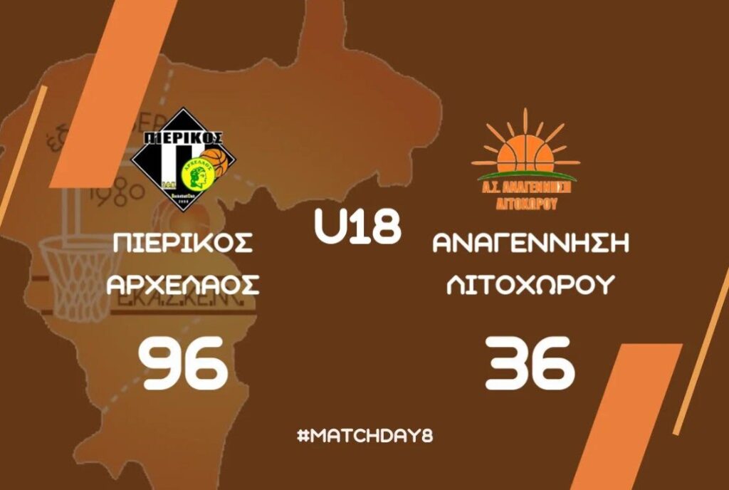 Ο Πιερικός Αρχέλαος επικράτησε με 96-36 της Αναγέννησης Λιτοχώρου, στο Κλειστό Γυμναστήριο Σιδηροδρομικού Σταθμού Κατερίνης, σε αγώνα για την 8η αγωνιστική του α’ ομίλου της α’ φάσης του πρωταθλήματος εφήβων της ΕΚΑΣΚΕΜ.