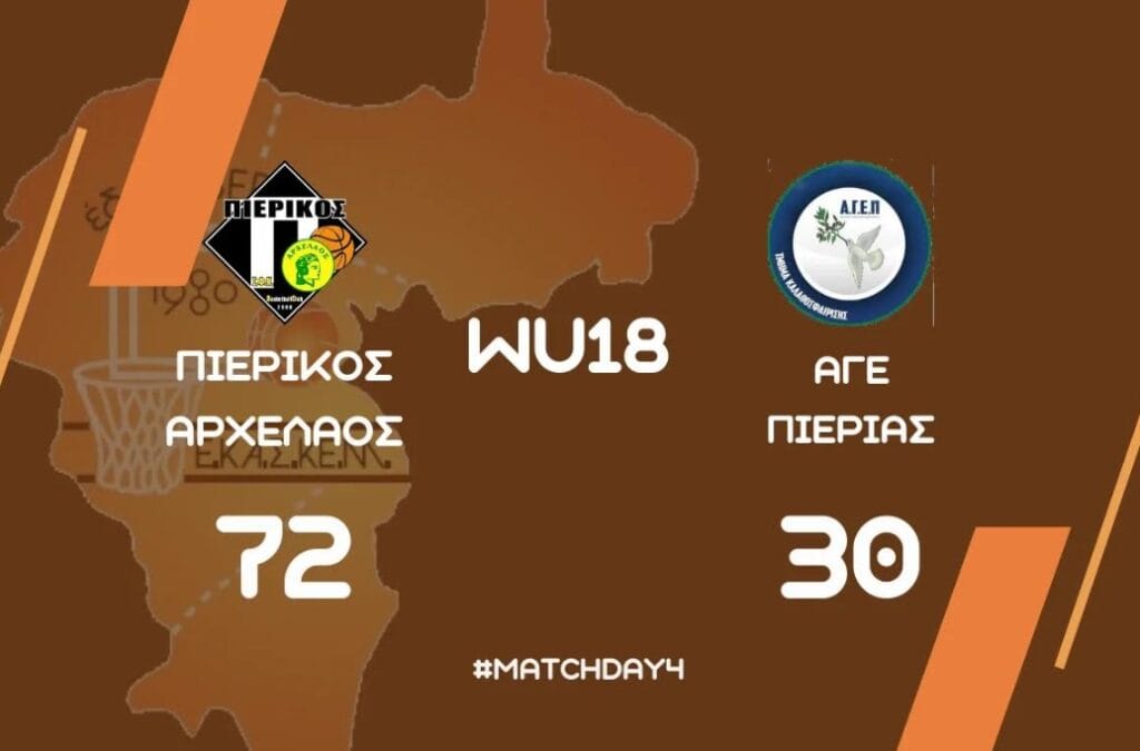 Ο Πιερικός Αρχέλαος επικράτησε με 72-30 της ΑΓΕ Πιερίας, στο Κλειστό Γυμναστήριο Σιδηροδρομικού Σταθμού Κατερίνης, σε αγώνα για την 4η αγωνιστική του πρωταθλήματος νεανίδων της ΕΚΑΣΚΕΜ.