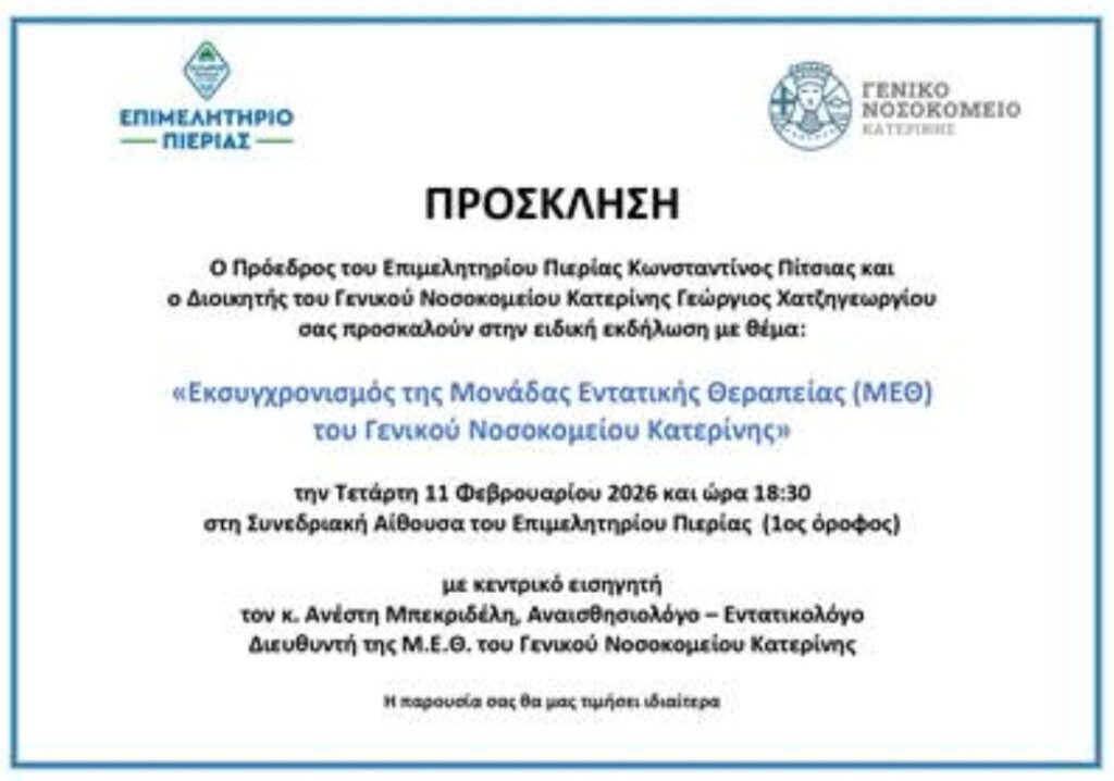 Πρόσκληση σε εκδήλωση «Εκσυγχρονισμός της Μονάδας Εντατικής Θεραπείας (Μ.Ε.Θ.) του Γενικού Νοσοκομείου Κατερίνης»
