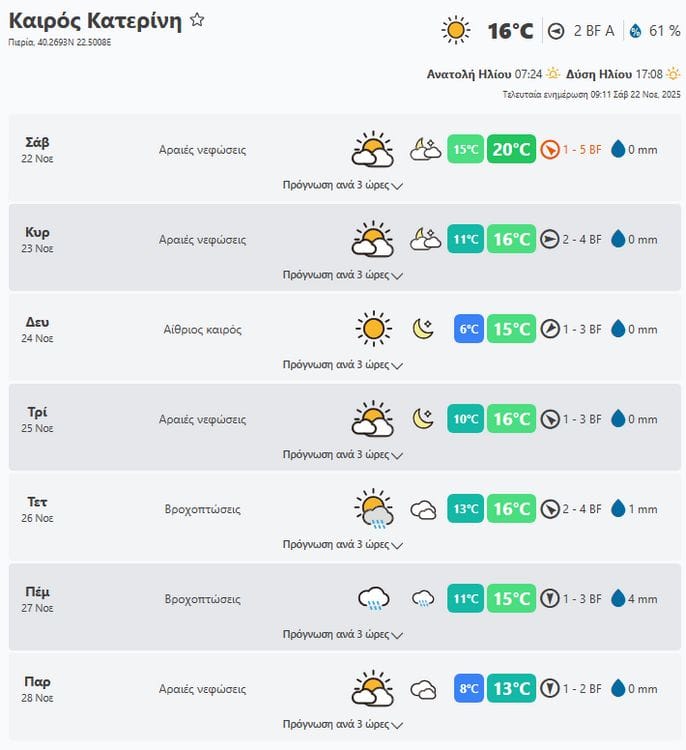 Σαββάτο 22 Νοεμβρίου o καιρός στην Πιερία. Δείτε τι καιρό θα κάνει το επόμενη εβδομάδα