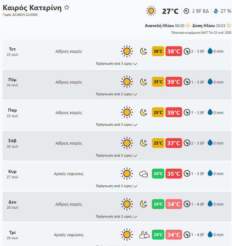 Τετάρτη 23 Ιουλίου o καιρός στην Πιερία. Δείτε τι καιρό θα κάνει το επόμενη εβδομάδα