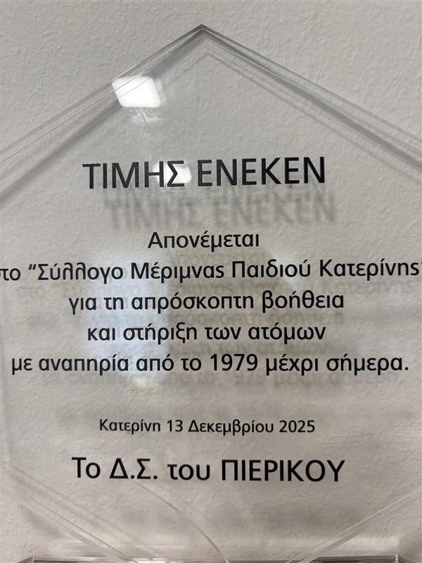 Το Σάββατο 13 Δεκεμβρίου 2025, η Μέριμνα Παιδιού Κατερίνης είχε την ιδιαίτερη τιμή να βραβευθεί από τον ΣΦΚ Πιερικός 1961, στο πλαίσιο εκδήλωσης του ιστορικού Συλλόγου.