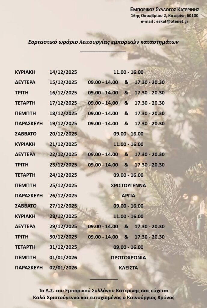 Ο Εμπορικός Σύλλογος Κατερίνης ανακοίνωσε το εορταστικό ωράριο λειτουργίας των καταστημάτων ενόψει των Χριστουγέννων και της Πρωτοχρονιάς. Όπως έγινε γνωστό, η αγορά θα παραμείνει ανοιχτή όλες τις Κυριακές του Δεκεμβρίου, δίνοντας τη δυνατότητα στους καταναλωτές να πραγματοποιήσουν άνετα τις γιορτινές τους αγορές.