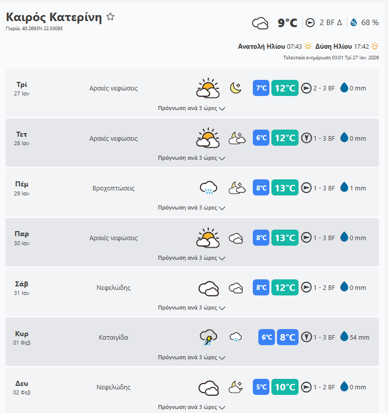 Τρίτη 27 Ιανουαρίου o καιρός στην Πιερία. Δείτε τι καιρό θα κάνει το επόμενη εβδομάδα