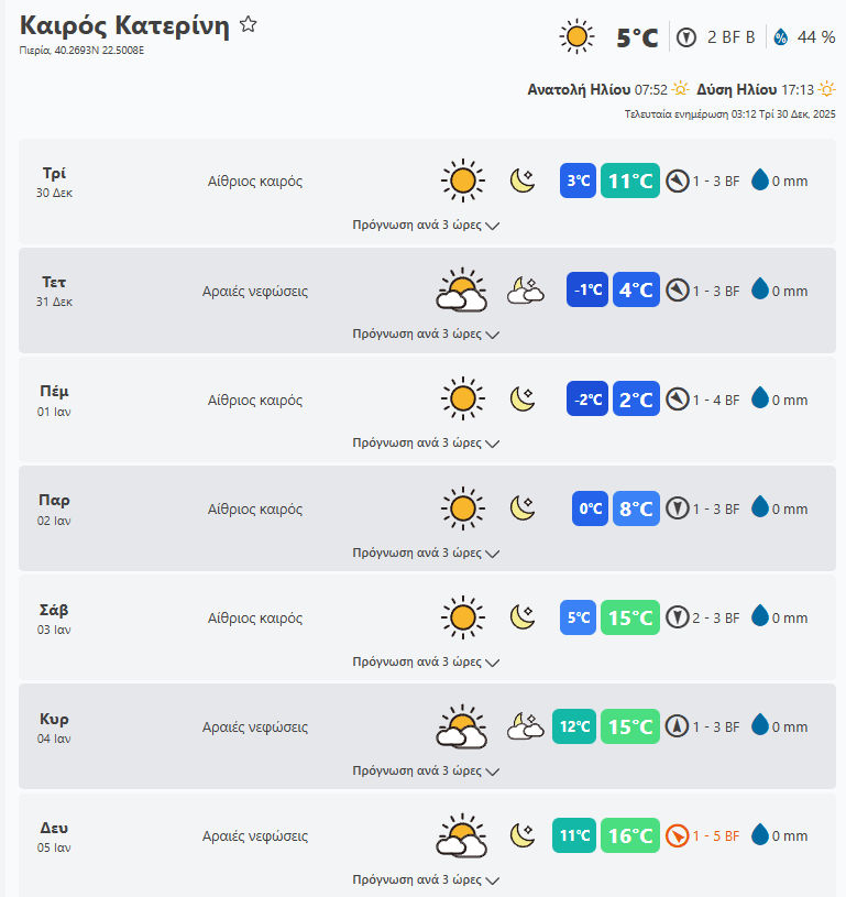 Τρίτη 30 Δεκεμβρίου o καιρός στην Πιερία. Δείτε τι καιρό θα κάνει το επόμενη εβδομάδα