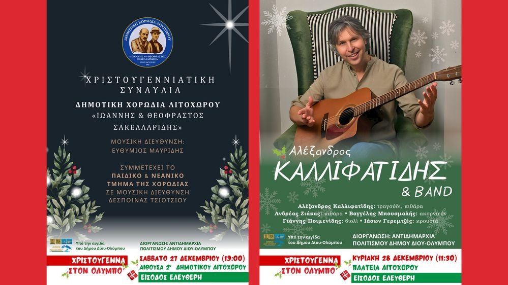 Δήμος Δίου-Ολύμπου: Χριστουγεννιάτικες συναυλίες το Σαββατοκύριακο 27-28 Δεκεμβρίου στο Λιτόχωρο με τη Δημοτική Χορωδία Λιτοχώρου και τον Αλέξανδρο Καλλιφατίδη & Band