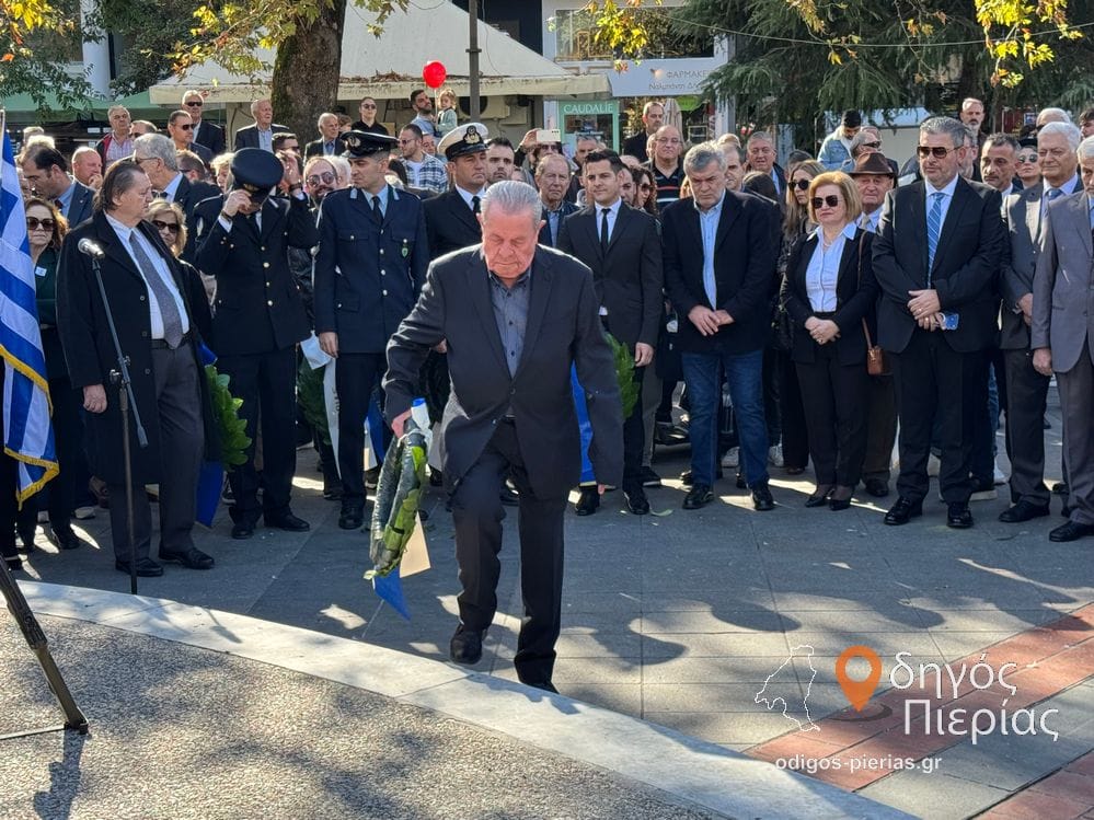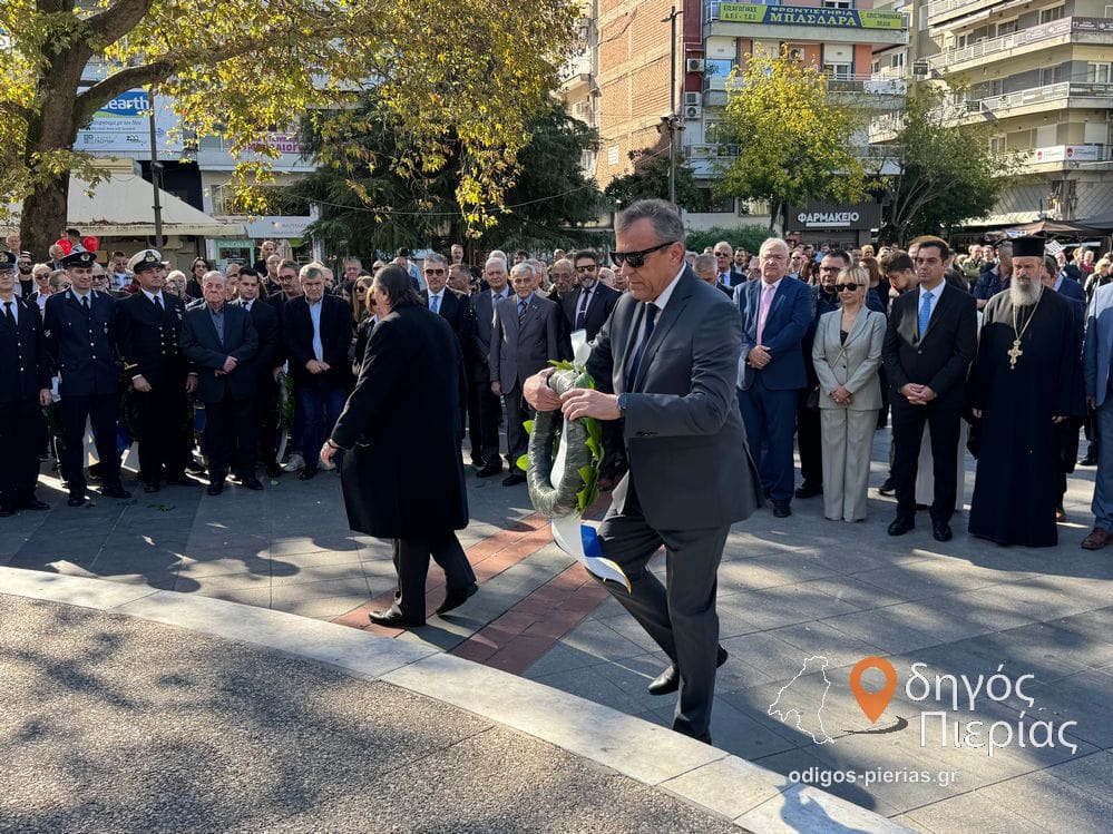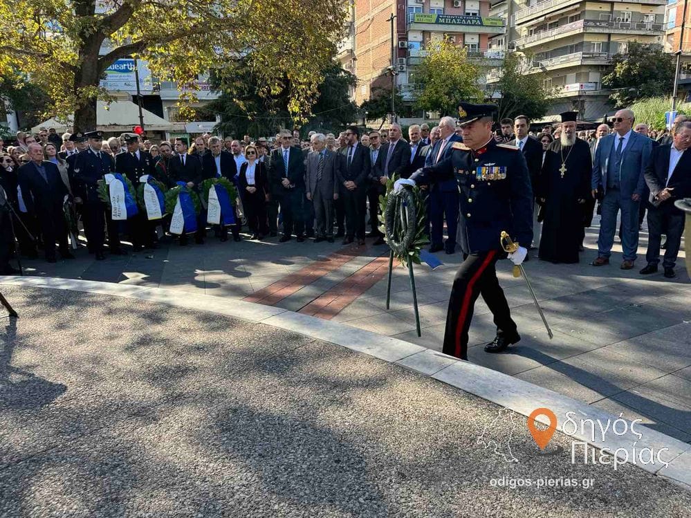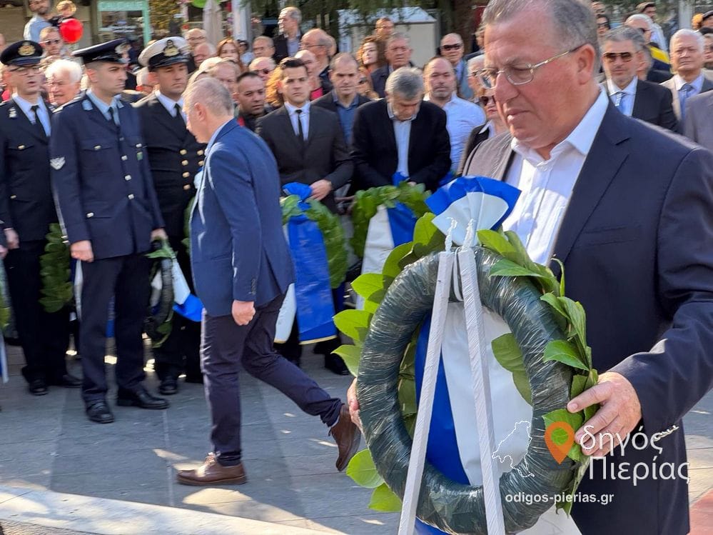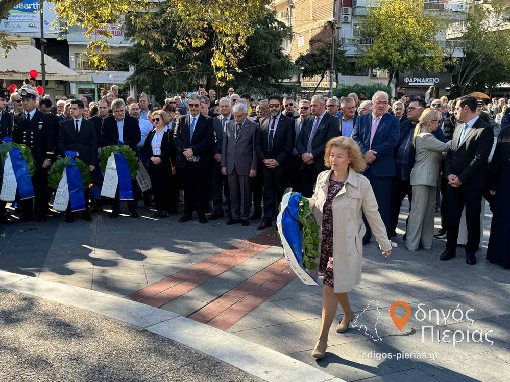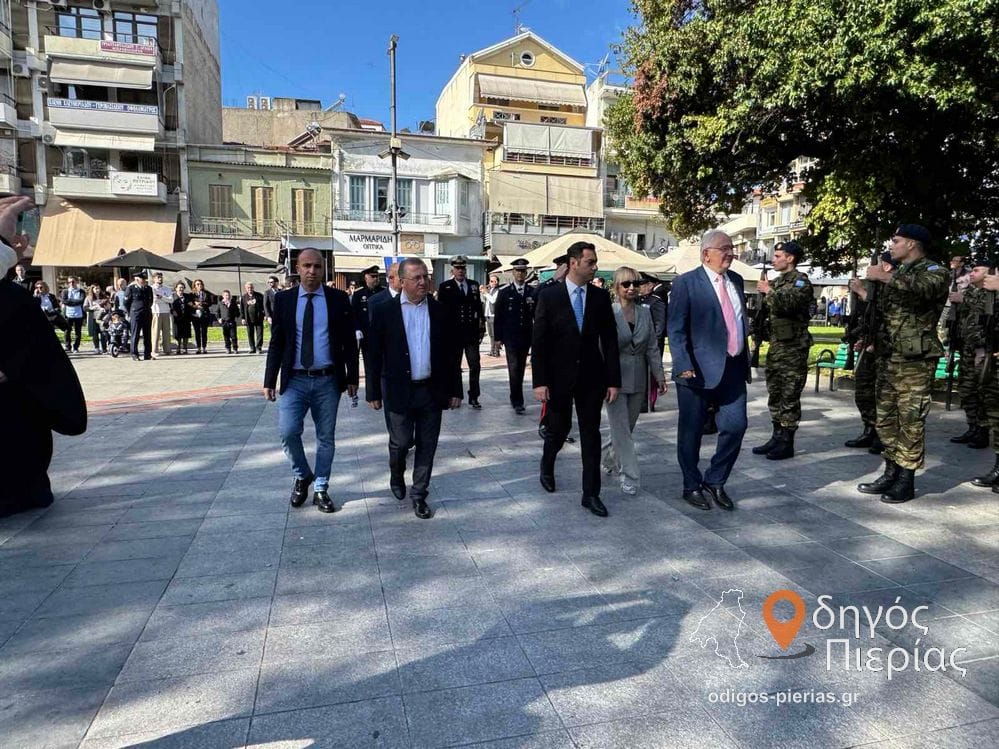Στην τελετή συμμετείχαν ο Εκπρόσωπος της Κυβέρνησης, ο Εκπρόσωπος της Βουλής των Ελλήνων, η Αντιπεριφερειάρχης Πιερίας, ο Δήμαρχος Κατερίνης, ο Ανώτερος Διοικητής Φρουράς Π.Ε. Πιερίας και Διοικητής της XXIV Τεθωρακισμένης Ταξιαρχίας, ο Αστυνομικός Διευθυντής Πιερίας, ο Διοικητής Πυροσβεστικών Υπηρεσιών Π.Ε. Πιερίας, ο Λιμενάρχης Σκάλας Κατερίνης, η Διευθύντρια Πρωτοβάθμιας Εκπαίδευσης Πιερίας, ο Διευθυντής Δευτεροβάθμιας Εκπαίδευσης Πιερίας, καθώς και εκπρόσωποι στρατιωτικών, αποστράτων, εφεδρειών, αναπήρων και θυμάτων πολέμου, Εφεδροπολεμιστικών Οργανώσεων, Οργανώσεων Εθνικής Αντίστασης και πολιτικών κομμάτων.