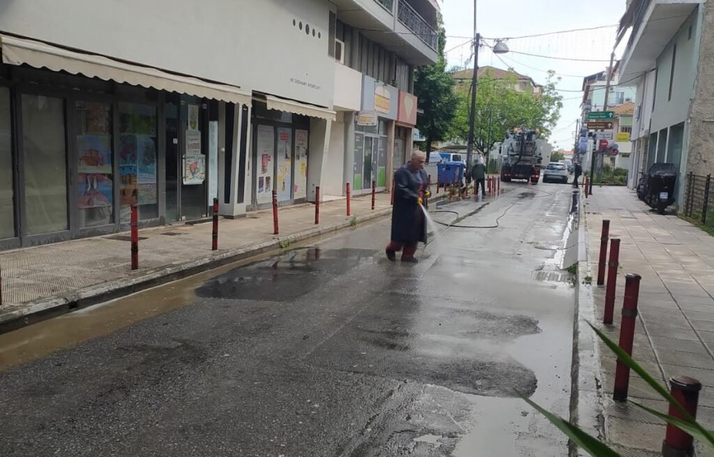 Στις εργασίες των συνεργείων συνέδραμε και υδροφόρα της Αντιδημαρχίας Καθαριότητας του Δήμου Κατερίνης όπου μετά το πέρας των εργασιών προχώρησε σε πλύσιμο του δρόμου.
