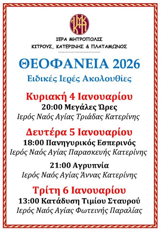 επί τη εορτή των Αγίων Θεοφανείων του Σωτήρος Χριστούστην Ιερά Μονή Οσίου Εφραίμ του Σύρου, Κονταριωτίσσης Κατερίνης Την Δευτέρα 5 Ιανουαρίου, από ώρα 8:30 μ.μ.