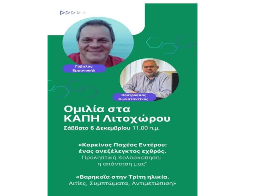 Η προγραμματισμένη για το Σάββατο 6 Δεκεμβρίου, στις 11:00 π.μ., εκδήλωση στο ΚΑΠΗ Λιτοχώρου, με θέματα την πρόληψη και ενημέρωση για θέματα υγείας, αναβάλλεται. Θέματα