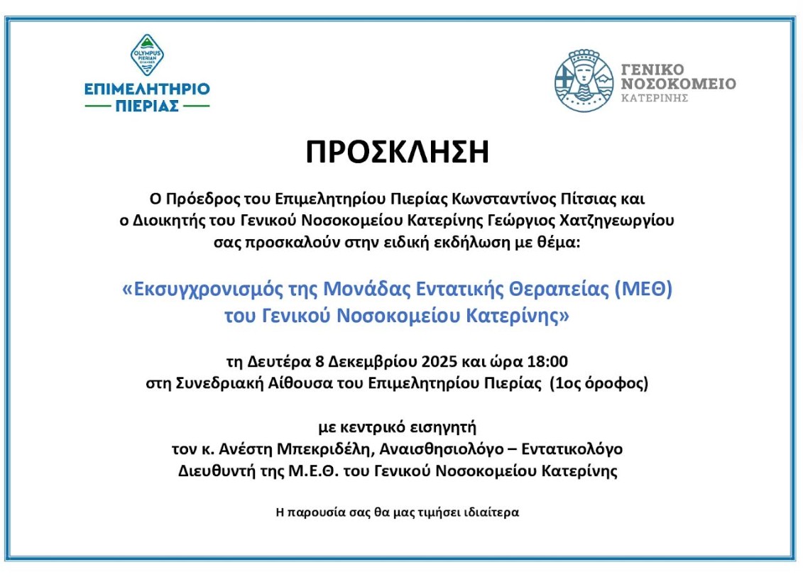 Καλείστε στην τακτική συνεδρίαση του Δημοτικού Συμβουλίου, στο δημοτικό κατάστημα στην κοινότητα Λιτοχώρου στις 10/12/2025 ημέρα Τετάρτη και ώρα 17:30 για συζήτηση και λήψη απόφασης