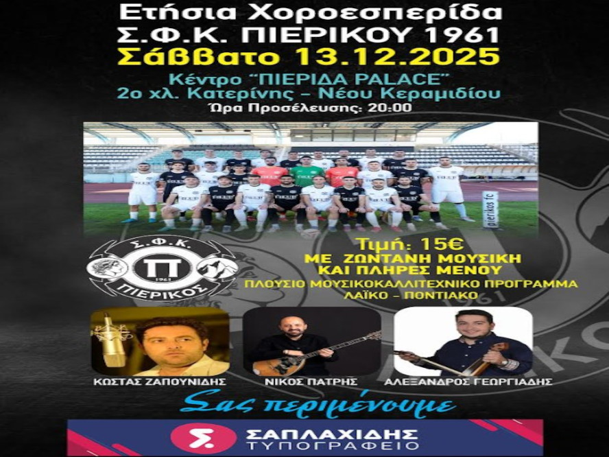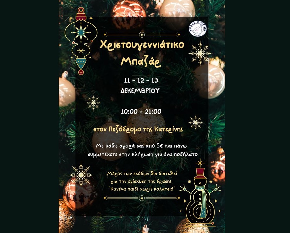 Χριστουγεννιάτικο Μπαζάρ Οι Κόρες Πιερίων σας προσκαλούν στο καθιερωμένο χριστουγεννιάτικο μπαζάρ που θα πραγματοποιηθεί την Πέμπτη 11, Παρασκευή 12 και Σάββατο 13 Δεκεμβρίου και ώρες