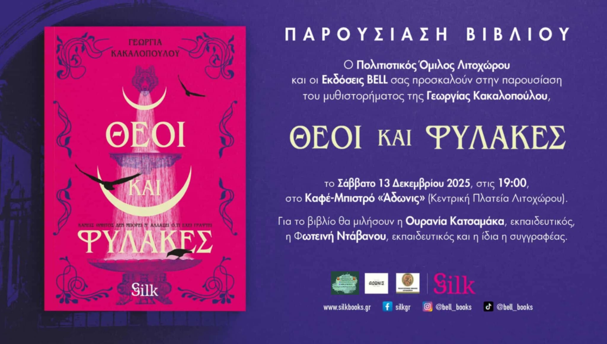 Παρουσίαση του νέου βιβλίου της Γεωργίας Κακαλοπούλου «ΘΕΟΙ ΚΑΙ ΦΥΛΑΚΕΣ» στο Λιτόχωρο. Ο Πολιτιστικός Όμιλος Λιτοχώρου, σε συνεργασία με τις εκδόσεις BELL και το Χαρτοσχολικό