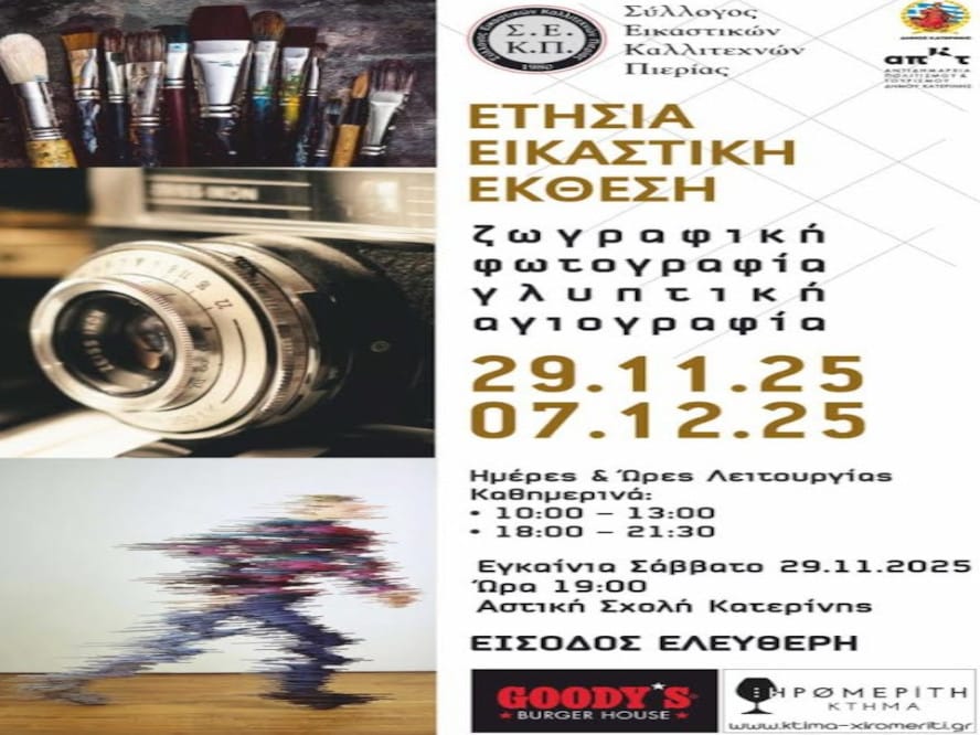 Ετήσια Έκθεση Συλλόγου Εικαστικών Καλλιτεχνών Πιερίας 2025Αστική Σχολή ΚατερίνηςΕγκαίνια: Σάββατο 29 Νοεμβρίου, 19:00 Ο Σύλλογος Εικαστικών Καλλιτεχνών Πιερίας έχει την τιμή να σας προσκαλέσει στα
