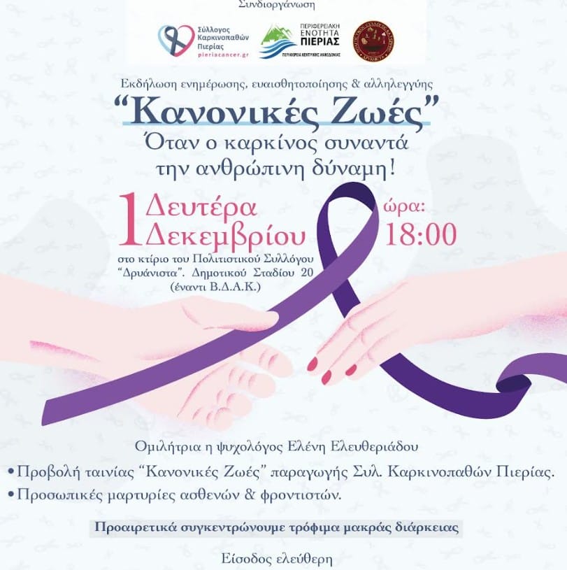«ΚΑΝΟΝΙΚΕΣ ΖΩΕΣ» Ο Πολιτιστικός Σύλλογος «ΔΡΥΑΝΙΣΤΑ» Κατερίνης σε συνεργασία με τον Σύλλογο Καρκινοπαθών Πιερίας και την Περιφερειακή Ενότητα , διοργανώνουν μια ξεχωριστή και συγκινητική εκδήλωση