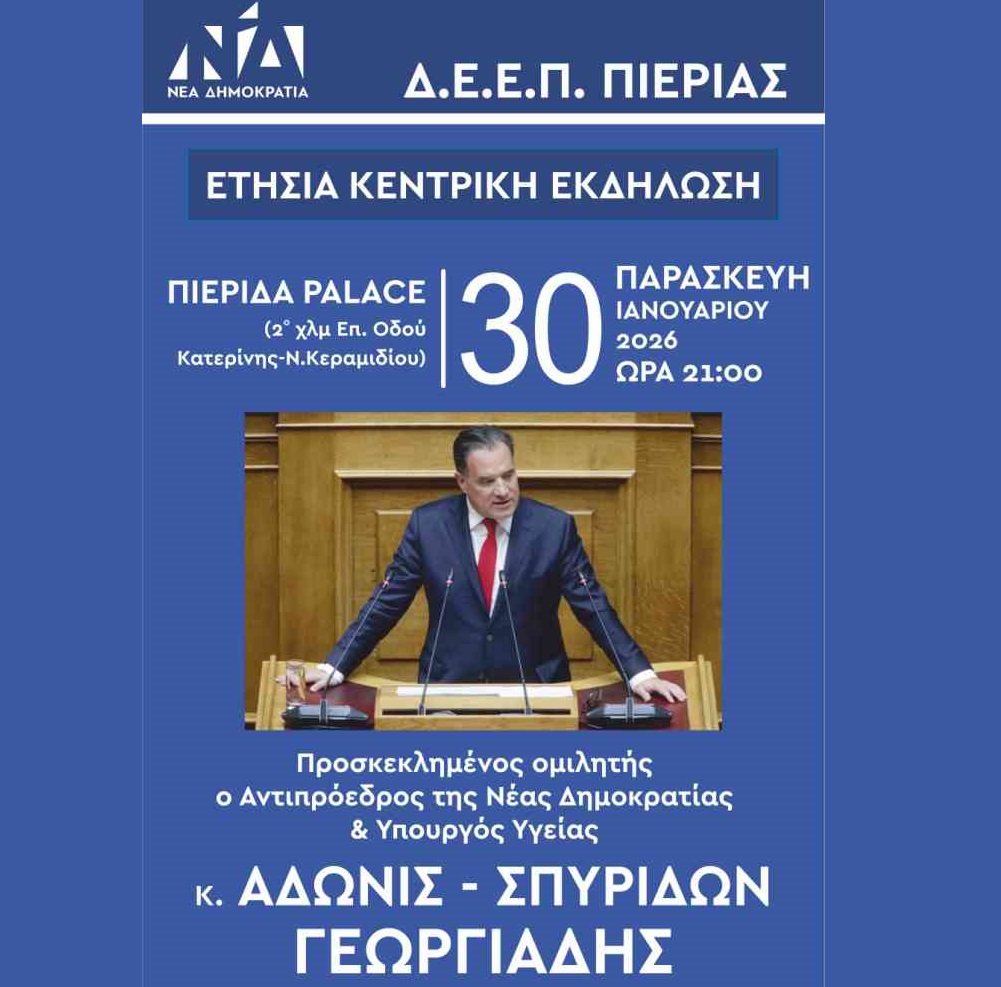 Η Δ.Ε.Ε.Π. Πιερίας της Νέας Δημοκρατίας σας προσκαλεί στην Ετήσια Κεντρική Εκδήλωσή της, την Παρασκευή 30 Ιανουαρίου 2026, στις 21:00, στο Pierida Palace. Ομιλητής: Άδωνις
