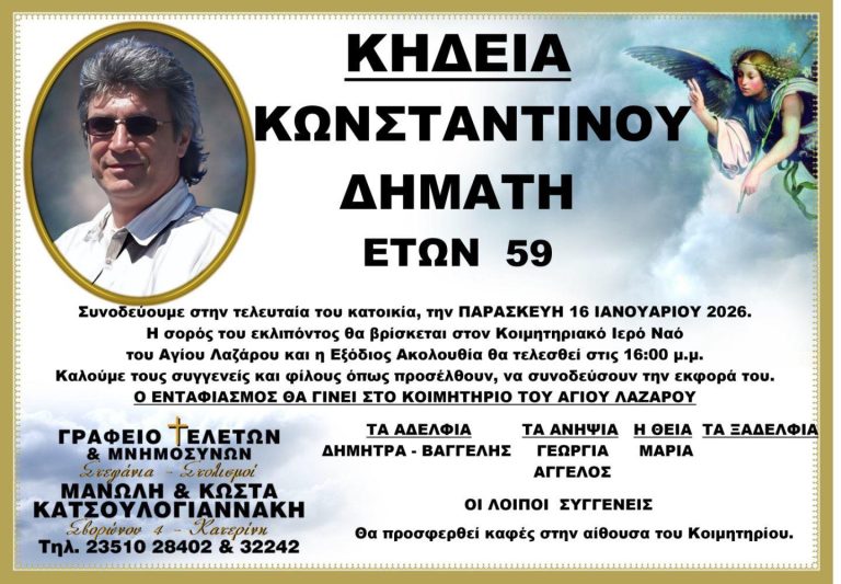 Έφυγε από τη ζωή ο Κωνσταντίνος Δημάτης, σε ηλικία 59 ετών, σκορπίζοντας θλίψη στην οικογένεια, τους συγγενείς και τους φίλους του. Η νεκρώσιμη ακολουθία θα