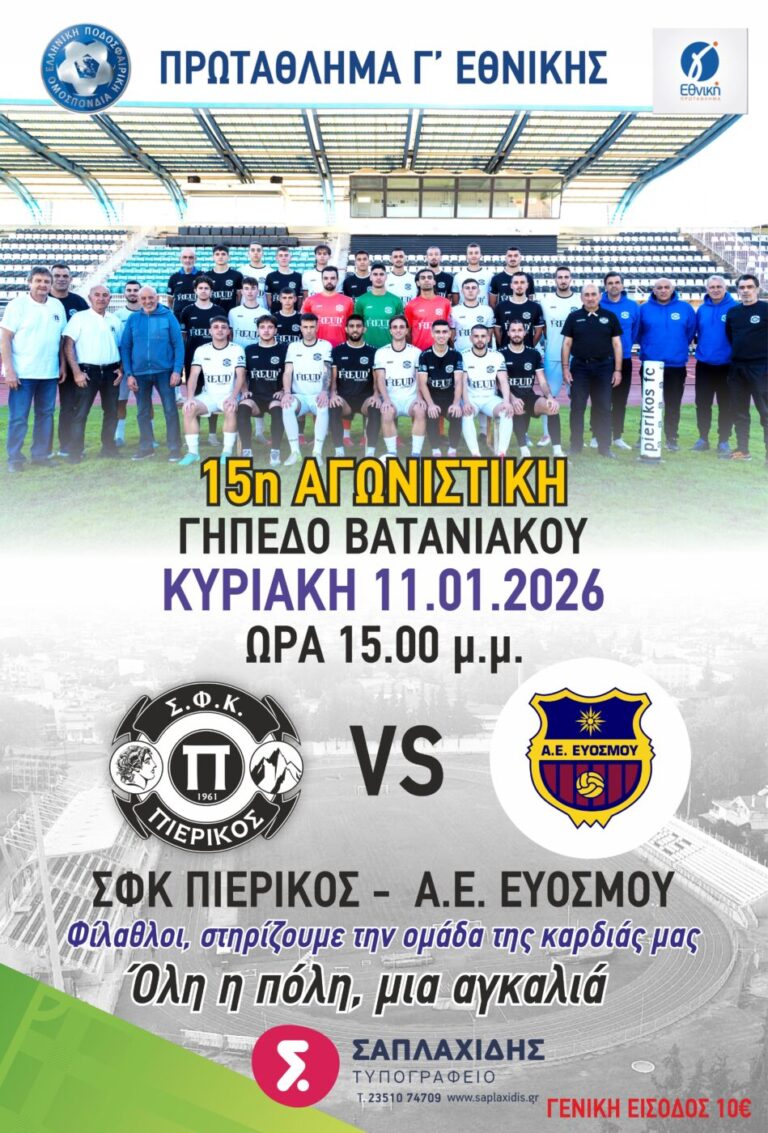 Κυριακή 11 Ιανουαρίου – Γήπεδο Βατανιακού ώρα 15.00. Στο Δημοτικό γήπεδο του Βατανιακού ο Πιερικός θα αντιμετωπίσει την Α.Ε Ευόσμου στο πλαίσιο της 15ης αγωνιστικής του 2ου