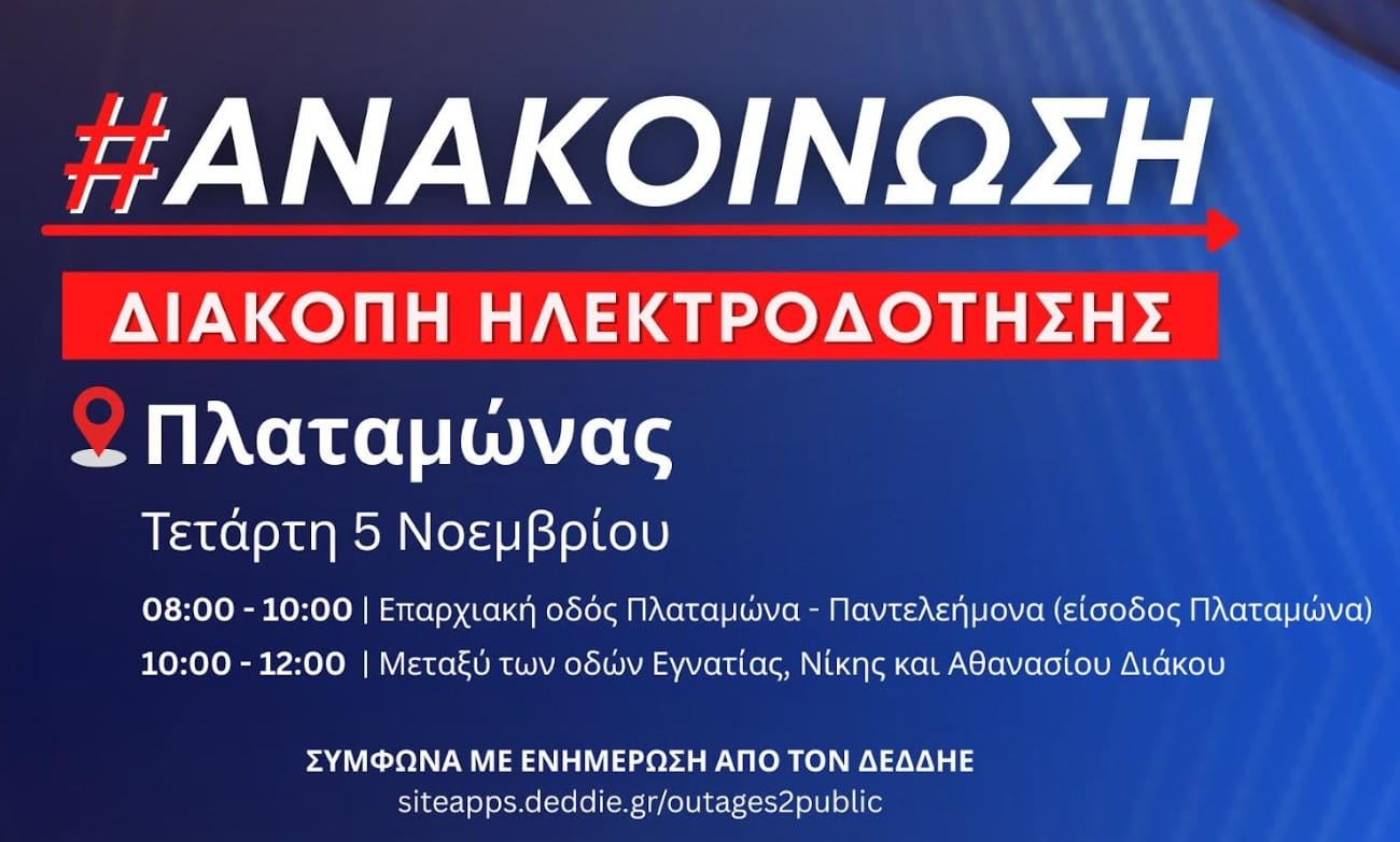 Σύμφωνα με ενημέρωση από τον ΔΕΔΔΗΕ, την Τετάρτη 5 Νοεμβρίου 2025 θα πραγματοποιηθούν προγραμματισμένες διακοπές στην ηλεκτροδότηση στα παρακάτω σημεία της δημοτικής κοινότητας Πλαταμώνα: Περιοχή: