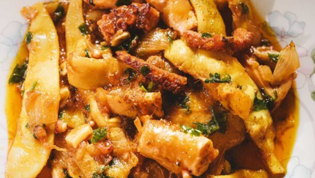 Προσθέτουμε το χταπόδι και μαγειρεύουμε για άλλα 10-15 λεπτά, μέχρι να γίνουν όλα τα υλικά και να μελώσει το φαγητό.